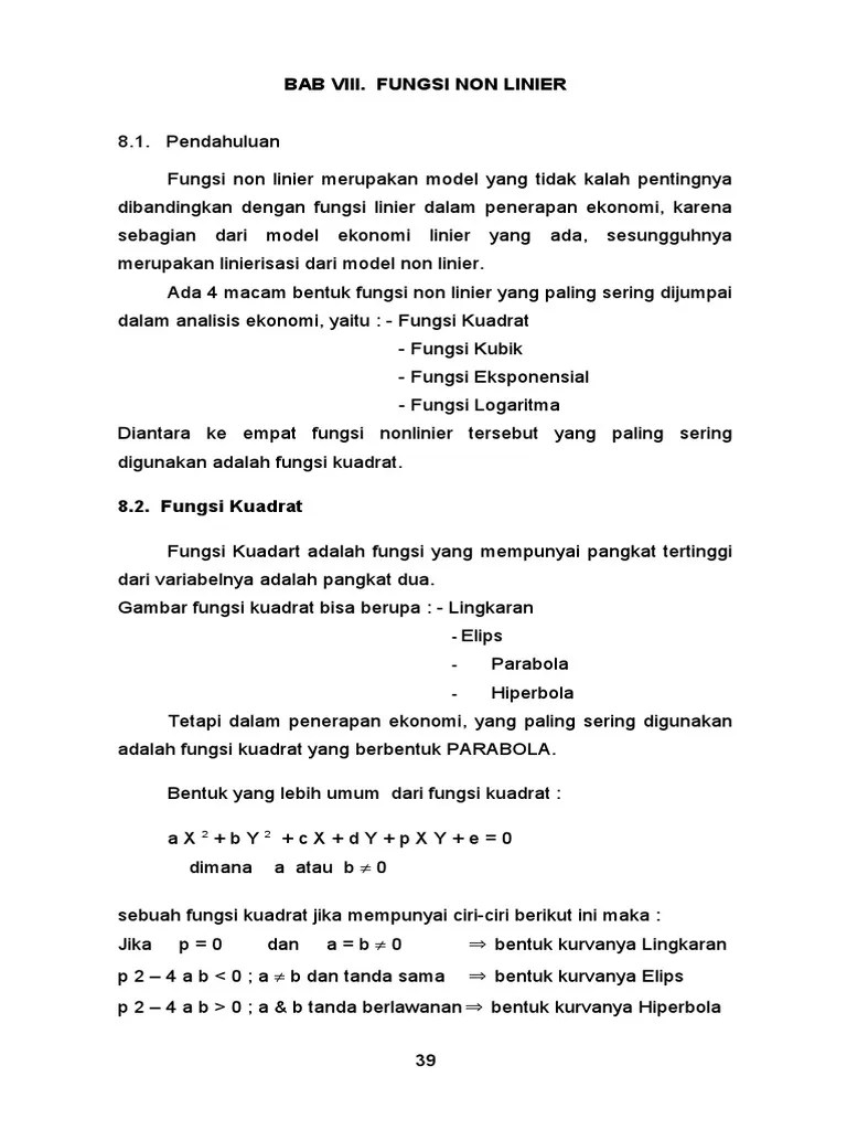 Fungsi permintaan dan penawaran, serta keseimbangan pasar. Bentuk umumnya adalah y = a . Fungsi non linear universitas negeri malang fakultas ekonomi s1 akuntansi offering dd; Ekonomi unnar fungsi non linier 9/16/2008 fungsi linier dapt berupa fungsi kuadrat dan fungsi rasional (fungsi pecah) grafik fungsi kuadrat . Grafik dari fungsi kuadrat ini merupakan garis tidak lurus berbentuk parabola. Pada pertemuan ini penerapan fungsi nonlinear yang dijelaskan yaitu pada: Pendahuluan fungsi non linier merupakan model yang tidak kalah pentingnya dibandingkan dengan fungsi linier dalam penerapan ekonomi, . Penerapan fungsi non linier dalam ekonomi dan bisnis berupa fungsi permintaan, fungsi penawaran, keseimbangan pasar, fungsi penerimaan, fungsi biaya dan .