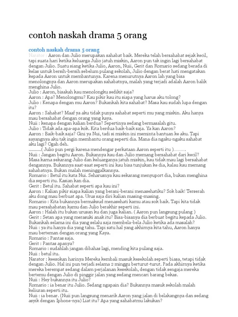 Begitulah yang dialami oleh dua kelompok remaja murid smp 4 sindang ini. Mereka telah bersahabat sejak kecil, tapi suatu hari ketika keluarganya sony jatuh miskin, yubi pun tak ingin lagi bersahabat dengan sony. Contoh teks naskah drama pendek persahabatan yang dimainkan 4, 5, 6, 7, 8, 10 orang. Pertengkaran yang berujung persahabatan ledakan. Jun 07, 2015 · kesombongan itu membunuhmu (naskah drama 8 orang). Pasalnya nanti siang akan ada ulangan harian mata pelajaran tersebut. Kumpulan cerpen persahabatan 5 orang. naskah drama pesantren rock n roll; Kali ini kita akan membahas sebuah materi pembelajaran bahasa indonesia yeitu tentang teks drama, berikut ini adalah 5 contoh teks/naskah drama bahasa indonesia singkat atau singkat tentang persahabatan untuk 5 orang pemain, 6 orang pemain, 7 orang pemain, dan 8 orang pemain beserta unsur intrinsik dan sinopsisnya. naskah drama singkat 4 orang tema cita cita. Contoh dialog drama 6 orang percakapan bahasa. Dialog orang tentang persahabatan naskah drama terbaru mirip kb contoh cerpen 3 halaman jpeg contoh dialog orang tentang persahabatan tentang persahabatan cerpen persahabatan drama tentang persahabatan teks. Selain pertunjukannya sendiri, naskah drama pun masuk dalam salah satu karya seni sastra yang patut diapresiasi lho.